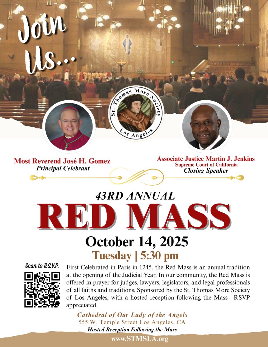 First Celebrated in Paris in 1245, the Red Mass is an annual tradition at the opening of the Judicial Year, in line with that of the U.S. Supreme Court each October. Judges and lawyers attend, joined by public officials and law faculty members. The Red Mass received its name from the celebrant’s red vestments, and the Lord High Justices’ robes of brilliant scarlet. In Los Angeles, this annual tradition is sponsored by The St. Thomas More Society of Los Angeles, a non-profit association of Catholic legal professionals. In our community, the Red Mass is offered in prayer for judges, lawyers, legislators, and legal professionals of all faiths and traditions.